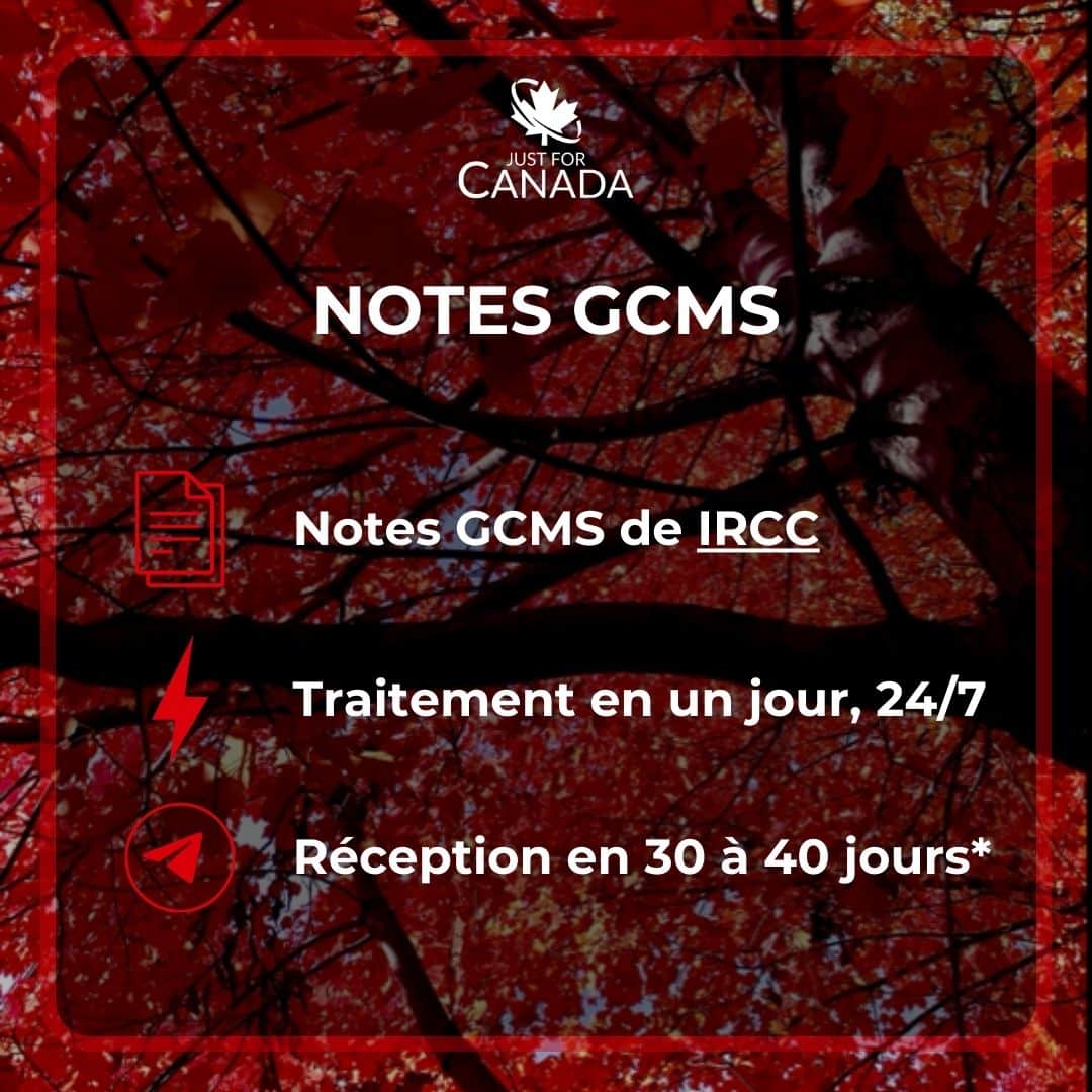 Les Notes GCMS sont demandées auprès de Immigration, Réfugiés et Citoyenneté Canada (IRCC) et contiennent tous les détails de votre demande y compris les notes de l’agent d’immigration.